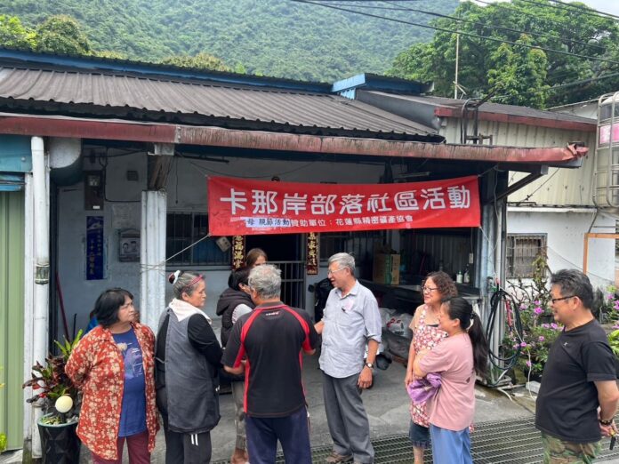 花蓮縣精密礦產協會理事長蔡鎰輝(中)與卡 那岸部落族人親切寒暄 。(圖∕精密礦產協會提供)